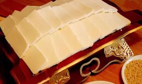 奶豆腐,蒙古语称"胡乳达",是蒙古族牧民家中常见的奶食品。用牛奶、羊奶、马奶等经凝固、发酵而成的食物。它不但有各种形状,而且刻有非常精致的民族传统图案,这样做出来的奶豆腐就不仅是一种食品,也包含了一定的艺术成分。蒙古人非常喜爱奶制品,奶豆腐可谓牛奶的精华,其蛋白质含量高达70.84%,富含氨基酸及其他有益身体的微量元素,是提高免疫力、美容养颜的佳品。外地人慕名而食却被酸得瞪大了眼睛,不敢再尝试第二口。很多人实在不理解这样奇怪的酸味为何牧民会如此喜爱。