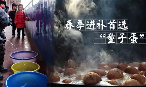 童子蛋在浙江省东阳市历史悠久,主要利用小便的沉淀物结晶——"人中白"的功效,可以滋阴降火、止血治淤。据说当地学校的教室门口都有一个大桶,男孩都在里面直接撒尿,很快就会有人来回收。把鸡蛋加入新鲜的童子尿一起大火煮开后,再把蛋取出来,把蛋壳敲裂,再放进去煮。过一定时间,把上下的鸡蛋换个位置,这样反复烧煮,用不同的火侯,整整煮上一天一夜,所煮鸡蛋称为"童子蛋"。一到春天卖童子蛋的小摊遍布大街小巷。虽然童子蛋贵过普通的茶叶蛋,可经常卖脱销。而外地人恐怕光是闻到那个味道都不忍心下嘴了。