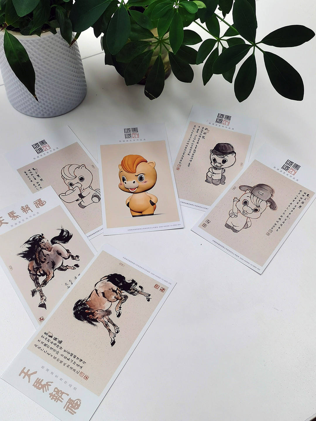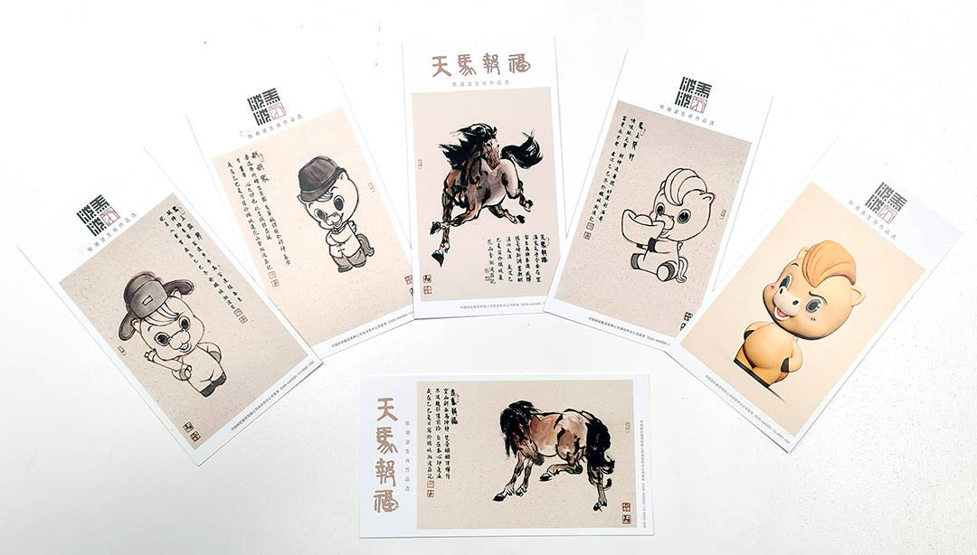 今年印制的贺年明信片,还有一个独特的文化特色。那就是陈湘波在明信片图案侧,自撰书写题画诗。如“马上发财”片:“啵啵驮元宝,财神追着跑;好运刷满屏,富贵永不老。”“马上高升”片:“骏蹄踏青运,宏图步步高;官运随春至,抱负入云霄。”“天马报福”片:“汉家天子今安在,今留玉马铸秦淮;我挥狼毫续新调,墨潮翻涌向天涯。” “吉马报福”片: “空山行雨马蹄静,梵音嫋嫋伴禅行;不需鞭影催前路,自在本心即蓬瀛。”他的题画诗不但给人们新年祝福,其诗还借助马年明信片歌颂了深圳当代精神的活力。