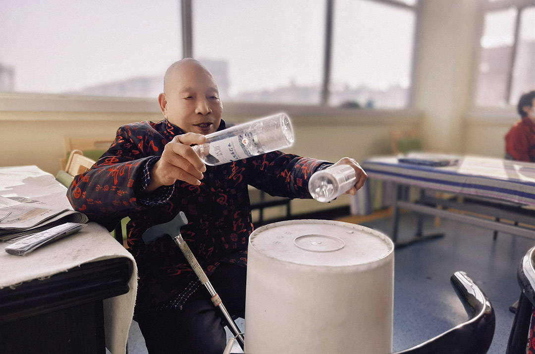 除了常见的儿童玩具,养老院里还有一些别具一格的“土玩具”,它们虽不起眼,却充满了创意与温情。油漆桶被巧妙地改造成了锣鼓,每当有老人轻轻敲打,便能发出清脆悦耳的声音,引来一阵阵掌声和欢笑。蒸馒头的篦子则变成了方向盘,老人们坐在轮椅上,仿佛驾驶着汽车穿梭在童年的小巷中,那份自由与畅快,让人不禁为之动容。更有甚者,铲雪、收粮食用的铣也被改造成了磨推玩具,老人们推着它,仿佛在重温年轻时的劳作场景,既锻炼了身体,又找回了那份久违的成就感。