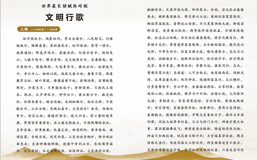 由姜典齐(中国·太原)所创作的楹联作品《文明行歌》,通篇采用骈赋文体,上下联各1056字,共2112字。日前,经世界纪录认证(WRCA)官方审核,该作品被确认为“世界最长骈赋体对联”。纪录编号:WRC260126C
