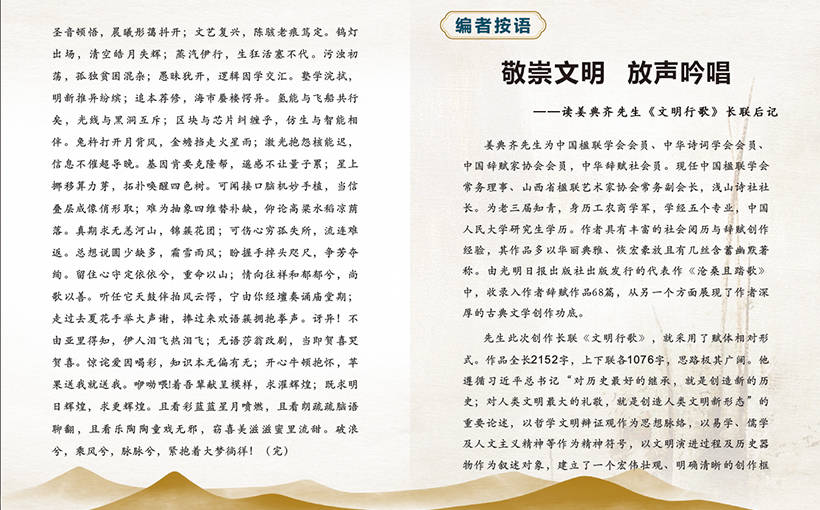 《文明行歌》长联作品以哲学文明辩证观作为思想脉络,以易学、儒学及人文主义精神等作为精神符号,以文明演进过程及历史器物作为叙述对象,呈现出一个宏伟壮观、明确清晰的创作框架。其以封建社会形成时间作为上、下联分界点,聚焦公元前476年前的文明起源,续写此后的文明发展,将世界文明发展过程中的重要事件及重要历史人物纳入行文视野,实现了与远古以来的历史文明进行时空对话,构成了一部浓缩的人类文明史诗。