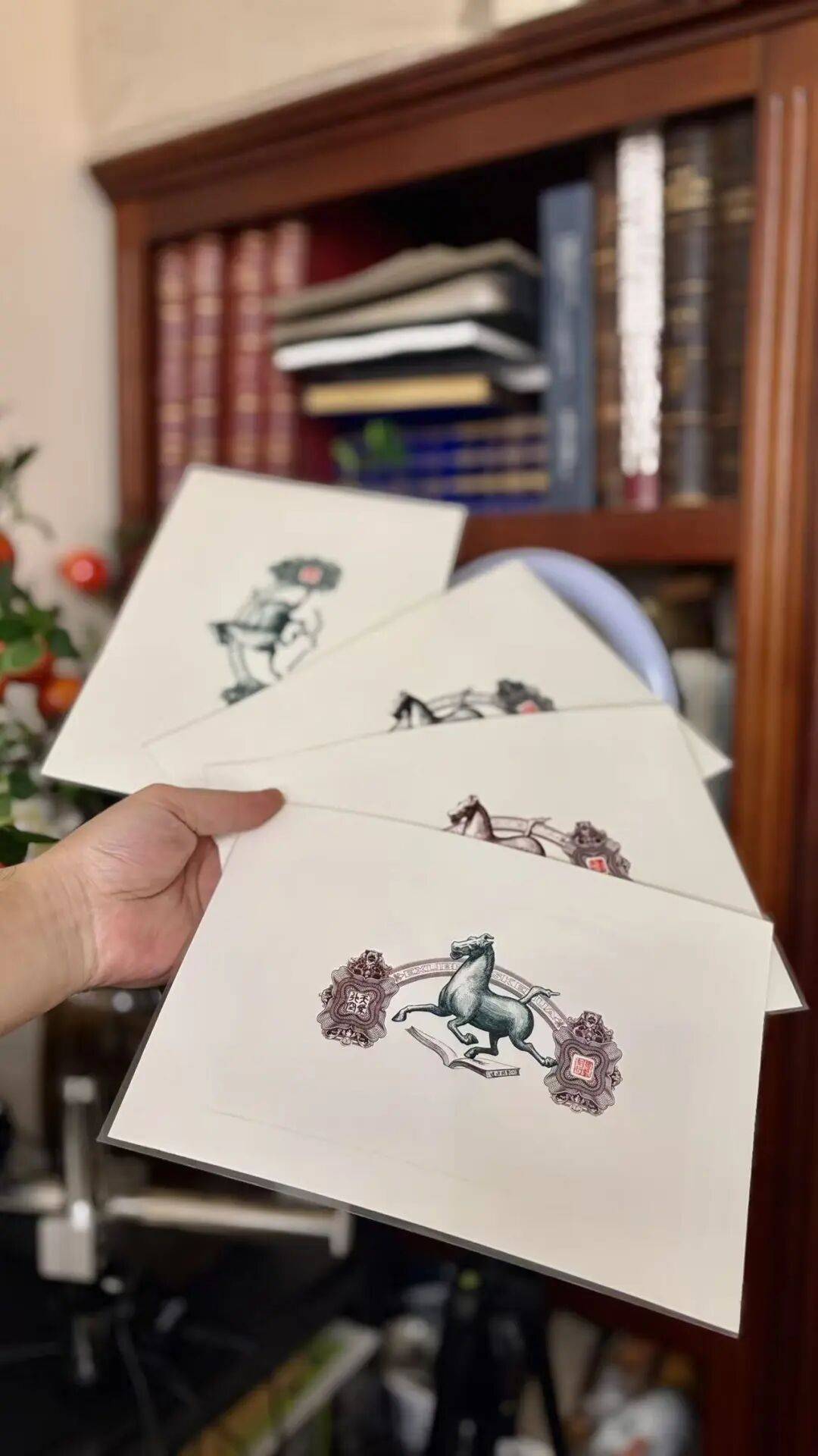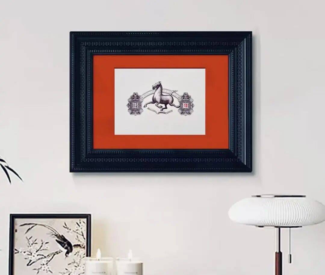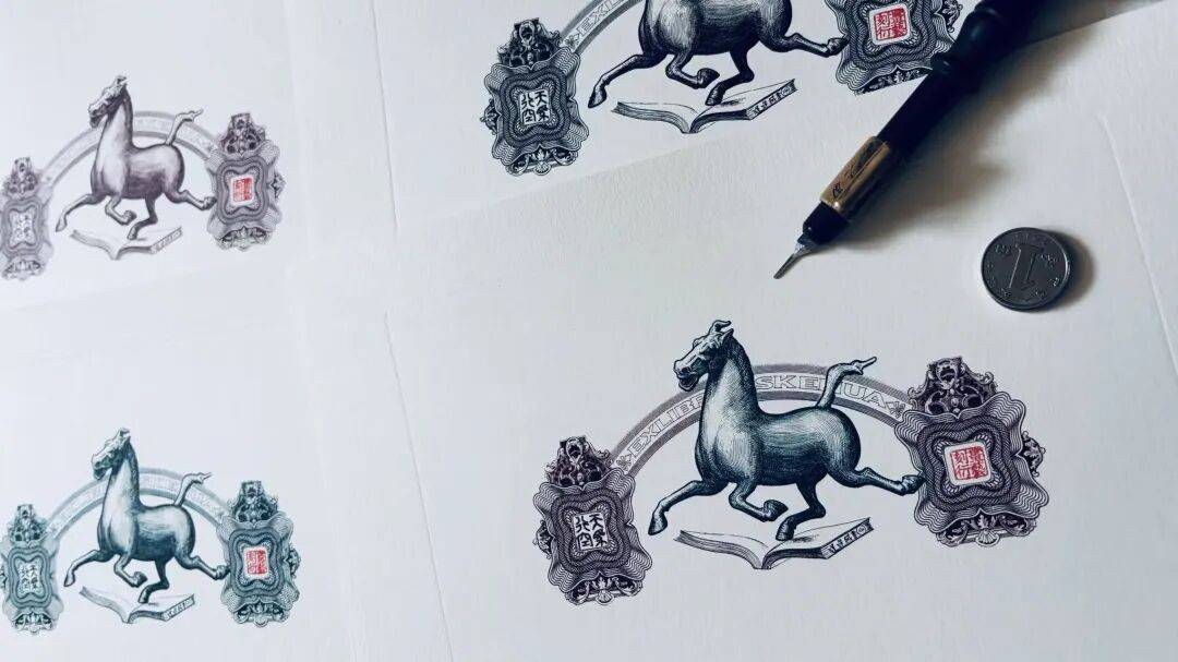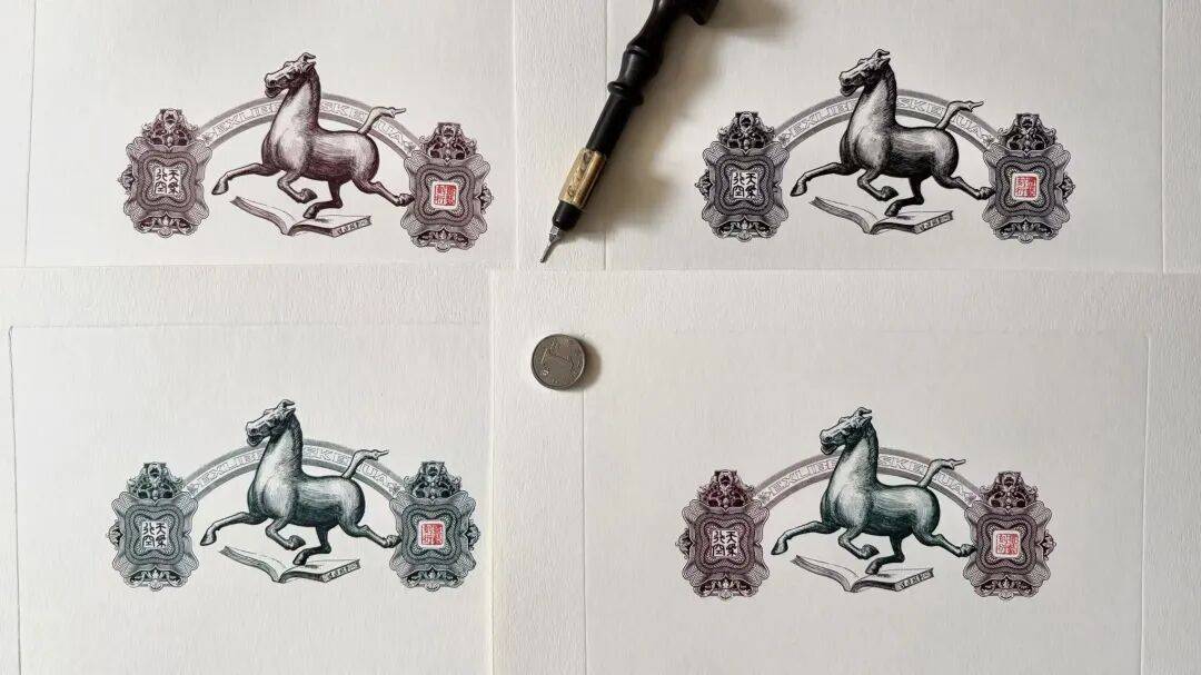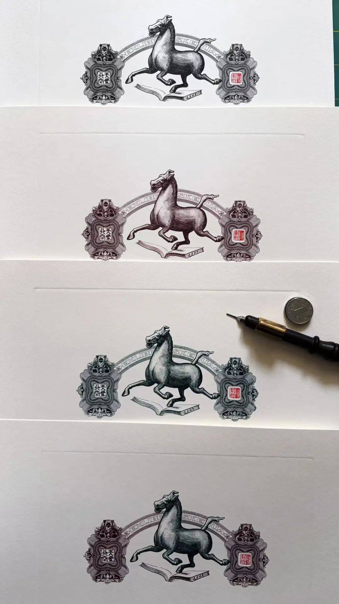 技法与创作规范层面,作品尽显汪洋先生作为一名铜版雕刻师的专业素养。汪洋先生曾向台湾雕刻大师孙文雄与国内著名雕刻师李学军学习,在学习过程中,他汲取了两位前辈对凹版线条的极致把控力与对东方美学的深刻理解,同时以纯手工凹版印刷工艺,用“4色多版本刷色”的方式呈现作品:青铜绿、紫檀棕、玄黑3种单色版本各226张,更有仅100张的稀缺双色版本,总计编号226套,严格遵循国际版画规范,其中包含26张按10%标准编号的AP版,仅用于展览交流,尽显专业创作的严谨性与收藏价值。奔马的躯干以不同方向的排线层层叠加,通过线条的疏密、粗细变化塑造出青铜的厚重质感与细腻光影,明暗过渡自然如古典油画;两侧的装饰纹章则以繁复的波浪线与几何纹构成,精密严谨如防伪底纹,纹章内的篆刻文字与朱红印章,又将东方金石的韵味巧妙融入西方铜版画的经典构图中,实现了东西方艺术语言的自然交融,也正是他吸纳前辈技艺与个人创新的集中体现。