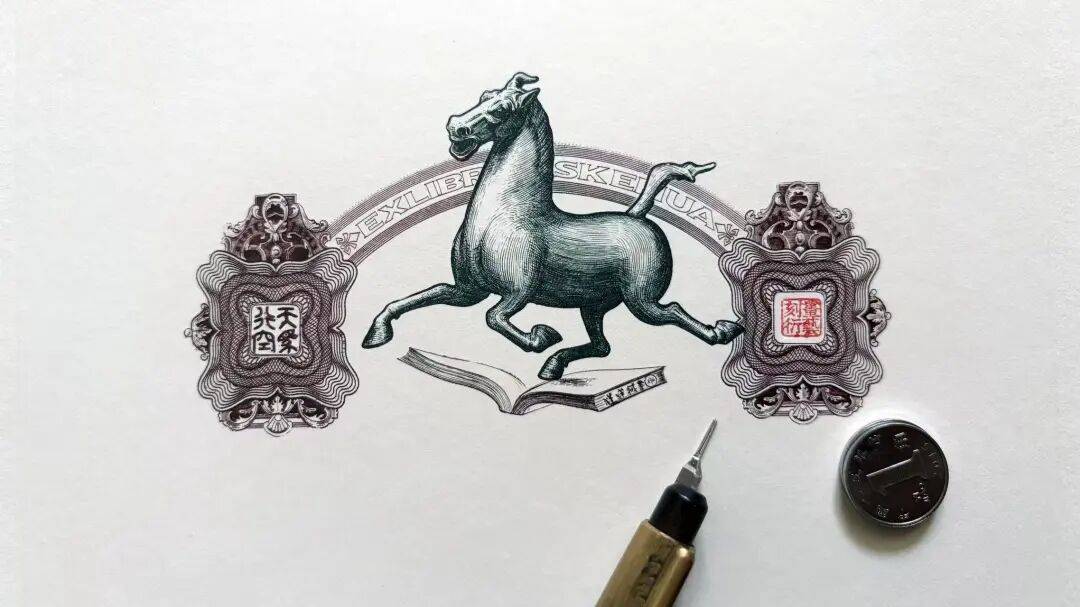 作品以东汉铜奔马(马踏飞燕)为灵感原点,汪洋先生以铜版刀笔为媒介,为这尊跨越两千年的文化符号赋予了全新的艺术生命。奔马四蹄腾空、昂首嘶鸣的姿态,被细密精准的排线赋予了肌肉的张力与风的速度:躯干的线条随肌肉走向起伏,鬃毛与马尾的笔触如箭镞般舒展,将“天马行空”的磅礴气势刻画得淋漓尽致;奔马脚下摊开的书本,又将这份奔涌的生命力锚定于书香之中,完成了从“文物符号”到“精神意象”的转译,立意精巧,意蕴悠长。