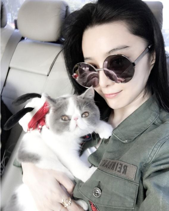 范冰冰抱着萌猫合影。