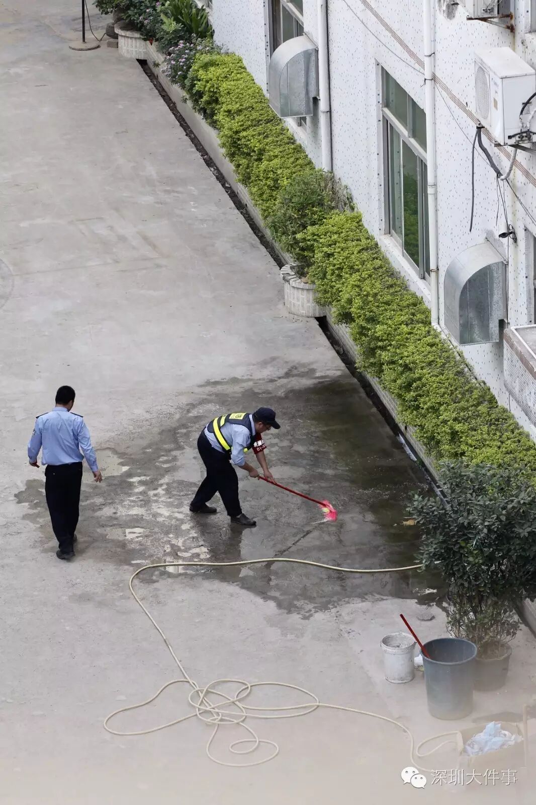 ▲事发家俱厂,有保安员正在淸洗坠楼地面血迹,据称弑亲男子行凶后选择从工厂4楼楼顶跳下。南都记者 徐文阁摄