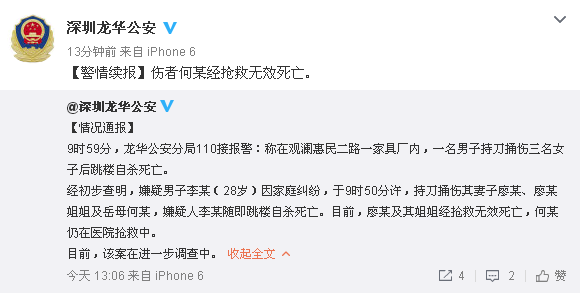 深圳龙华公安通报称,经初步查明,嫌疑男子李某(28岁)因家庭纠纷,于9时50分许,持刀捅伤其妻子廖某、廖某姐姐及岳母何某,嫌疑人李某随即跳楼自杀死亡。廖某及其姐姐经抢救无效死亡,何某也因抢救无效死亡。