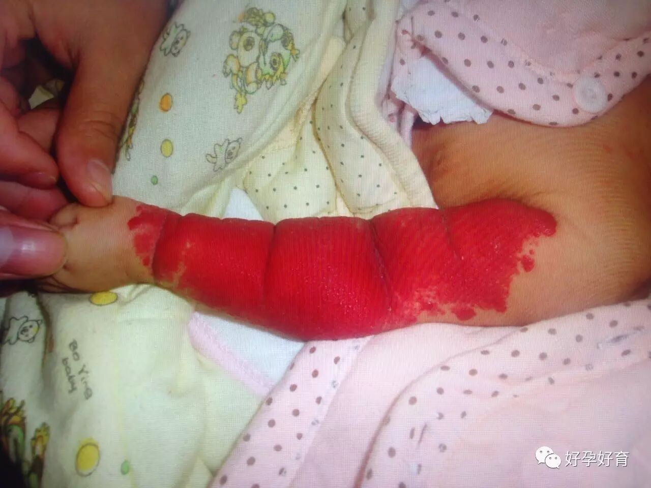 刚出生不久的宝宝,整条左臂呈血红色,原来是患婴幼儿血管瘤所致。