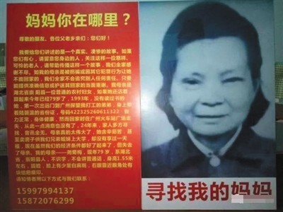 孙学奇介绍,由于担心母亲可能会通过广东到湖北的107国道徒步回乡,孙学奇甚至在2001年搬家到广州,一边开货车谋生,一边沿路寻找母亲下落,前后6年。那些年,孙学奇的足迹遍布广东各地,每经过一个地方,除了到派出所查询失踪人口资料,发放寻人启事外,还会去电视台投放寻亲广告。此外,孙学奇的儿子到广州读大学后,还曾带着同学在街头派发寻人启事。