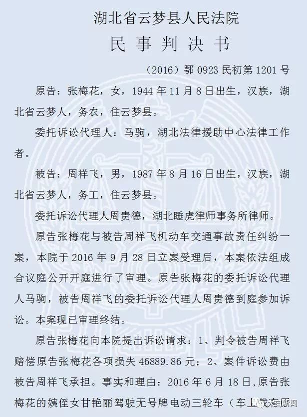 大白新闻(微信ID:dabaixinwen)今日(11月9日)在中国裁判文书网搜到了这篇湖北省云梦县人民法院于2016年12月27日作出的案号为“(2016)鄂0923民初第1201号”民事判决书,在网上也找到了案号为“(2017)鄂0923执174号”的执行通知书。