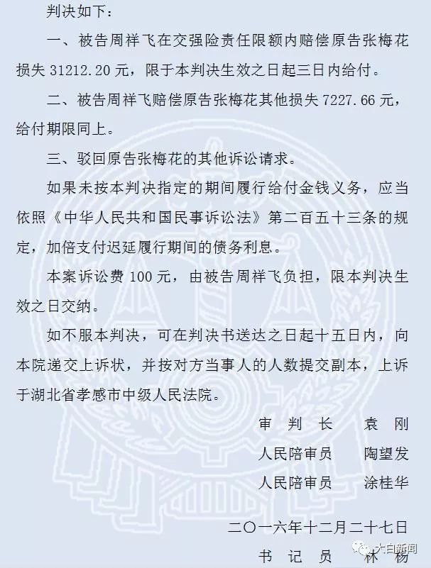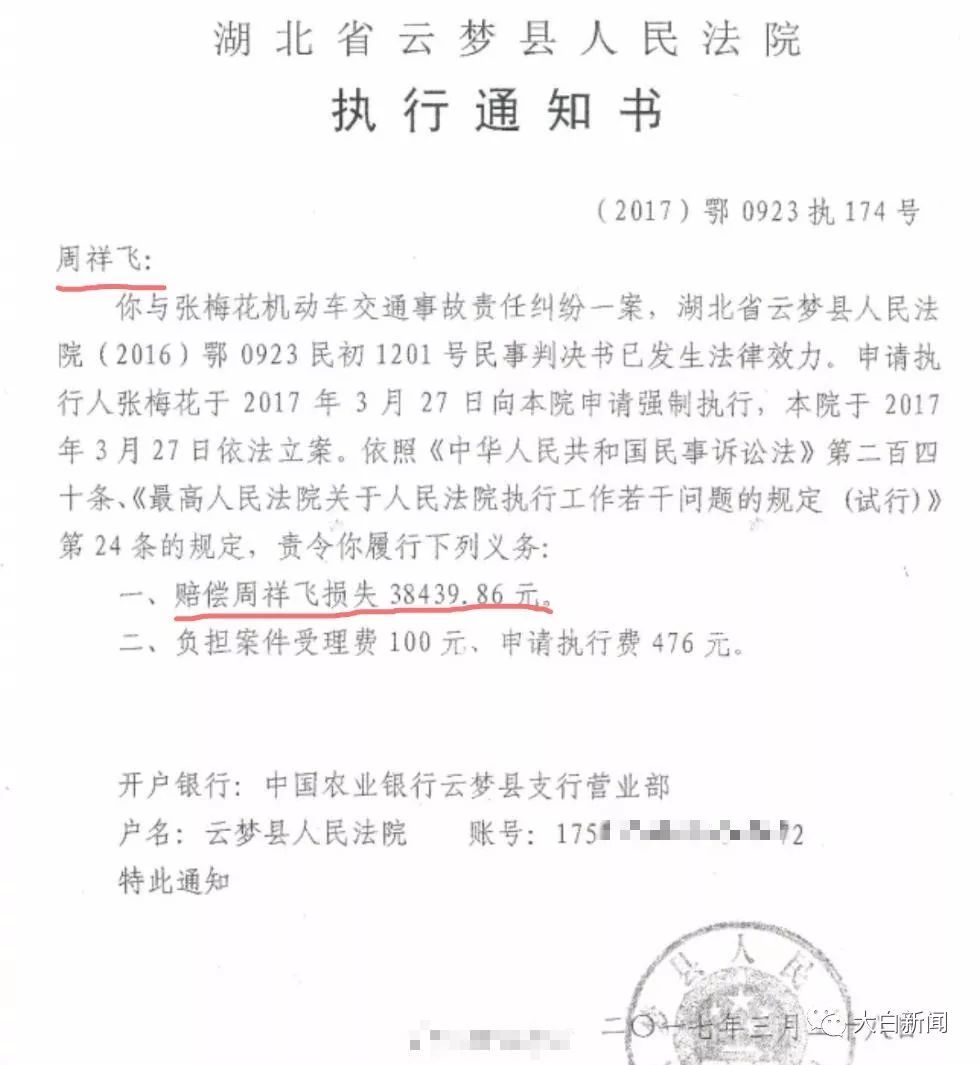 然而,大白新闻发现:在这份由张梅花申请强制执行的执行通知书里,却写着“赔偿周祥飞损失38439.86元”。看到这份执行通知书,大白新闻不禁问道:张梅花被撞伤了,为什么要赔偿被告周祥飞的损失?