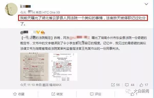 此外,今日(11月9日),此前在网上发文举报的那名网友也在其微博中表示:“前天曝光的湖北省云梦县人民法院的事情,法官昨天已被处以停职记过的处分”。[资料来源:中国裁判文书网、中国青年报、湖北云梦县人民法院等]
