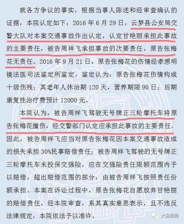判决书显示:就各方争议的事实,根据当事人陈述和经审查确认的证据,法院认定:2016年6月29日,云梦县公安局交警大队对本案交通事故作出认定,认定甘艳丽承担此事故的主要责任,被告周祥飞承担事故的次要责任,原告张梅花无责任。