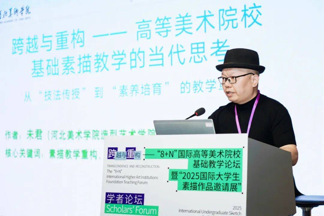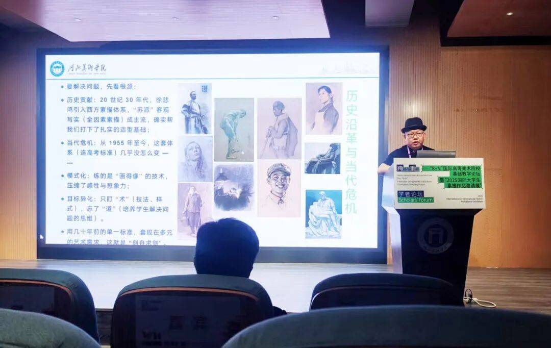 未君副教授的发言紧扣论坛核心议题,直指当前基础素描教学“应试化固化” 与 “美学价值弱化” 的双重矛盾,提出 “跨越单一流派依赖、跨越纯粹技术训练” 的 “双重跨越” 破局路径,及 “心态、素养、语言” 三维转向实施策略。其观点拓展了此次研讨的维度同时与各高等院校代表的分享形成学术呼应;既契合论坛“智能技术重塑教学体系” 的研讨方向,也使河北美术学院在基础教学领域的探索进入国际视野并获得同行广泛关注。