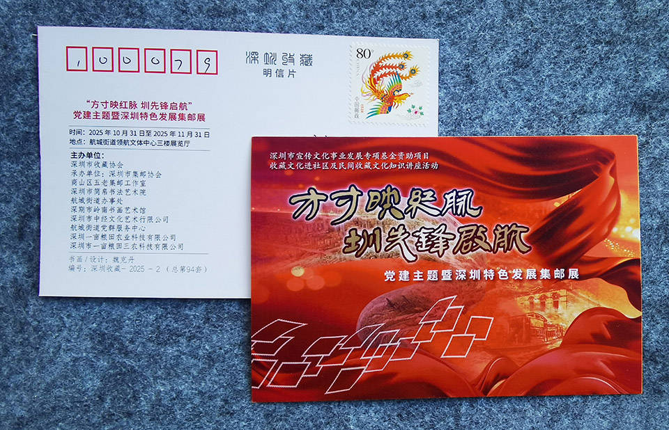 为纪念中国共产党成立104周年,深入贯彻落实党的二十大关于生态文明建设的战略部署。由深圳市收藏协会主办,深圳市集邮协会、南山区“五老集邮工作室”、航城街道办事处、航城街道党群服务中心、中国邮政集团有限公司深圳市分公司宝安局、深圳市简帛书法艺术院、深圳市岭南书画艺术馆、深圳市中经文化艺术有限公司、深圳一亩粮田农业科技有限公司、深圳市一亩粮田三农科技有限公司协办的“方寸映红脉 * 圳先锋启航”党建主题暨深圳特色发展集邮展于2025年11月21日至12月20日在深圳市宝安区航城街道文体中心举行。