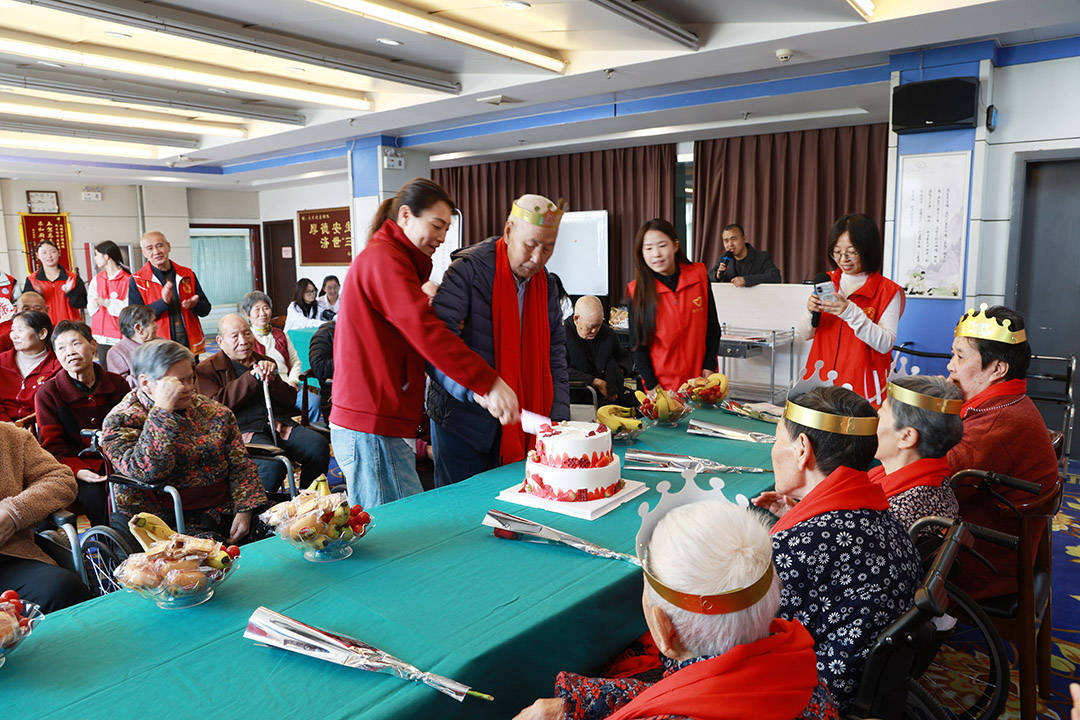 上午10时20分,庆生环节将活动推向高潮。志愿者们为六位寿星逐一佩献上鲜花和戴上生日帽,动作轻柔而充满敬意。随后,一辆点缀着鲜花的水果生日蛋糕被缓缓推入场中,烛光点亮,全场齐唱《生日快乐歌》。在众人的祝福声中,寿星代表们许下心愿,共同吹灭蜡烛。一位寿星动情地说:“今天很开心,谢谢大家记得我们!”