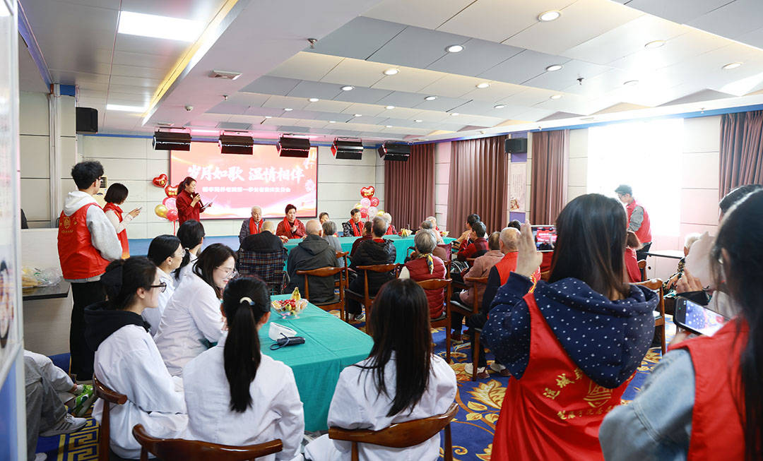 随后,志愿者团队献上了精心准备的歌曲表演。《甜蜜蜜》《健康歌》等经典曲目依次唱响,志愿者们走到老人身边,邀请会唱的长者一同哼唱,几位老人随着旋律轻轻拍手,现场气氛温馨动人。
