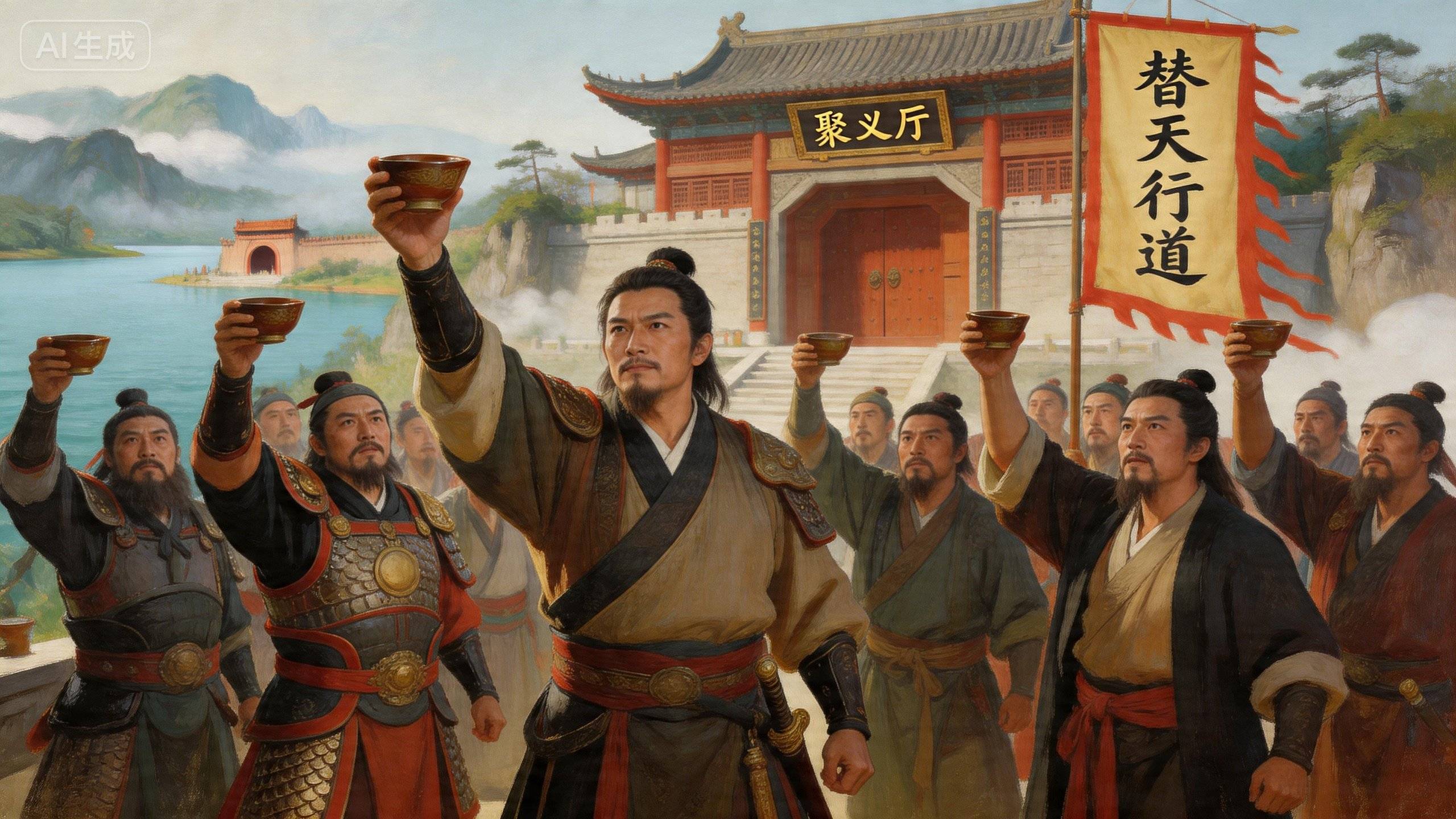智多星,及时雨,困无眠。奈乎些许,徒聚草莽撂家园?群曜旋风腾跃,荣辱随流逐远,忠义不苟全。唿喇一声去,荐血染婵娟!