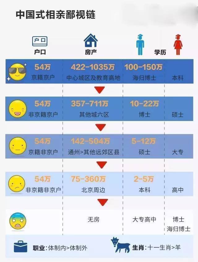 近日,由媒体总结的一条“中国式相亲鄙视链”火了。这条“中国式相亲鄙视链”,是一份大都市男女青年的“相亲价目表”。“价目表”上,相亲男性和女性的择偶标准和条件,按照“户口”“房产”“学历”所具有的优势、劣势,被分成了“顶配”“高配”“标配”“低配”“简配”“不考虑”等几个等级,从身价、职业、收入、车子、相貌等环节进行了明码标价。