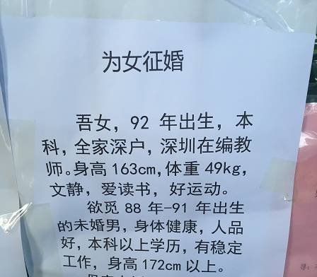 见到记者,普宁的林伯说:“现在90后都晚婚了。你放眼看去,有多少90后在这儿挂牌?”林伯还传授出了他一年来在相亲角暗中窥视后get到的结论:“在深圳,什么女生最好嫁?年轻、好看,再读过一丢丢书,就够了!”