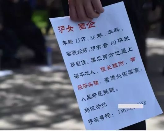 在上海许多公园,大家都会看到相亲,主要都是上海本地大龄剩女在亲人的代劳下相亲。他们将自己孩子的条件写的很清楚,将需要女孩的条件也介绍的很清楚。还有许多大龄女性,拼着事业却没有找到对象,一不小心就变成了剩女。