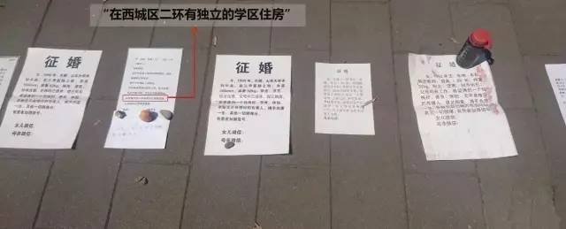 在一排征婚资料中,一位姑娘表示,自己在西城二环有独立的学区房,这样的住房条件在相亲角备受青睐。